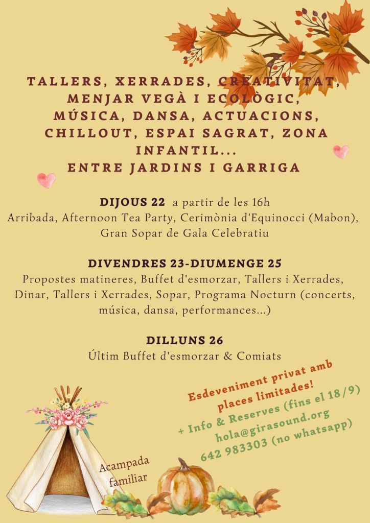 Amb tallers, xerrades, espai sagrat, zona infantil, menjar vegà i eco-lògic, música, dansa & escenari amb programa de nit (concerts, performances…)